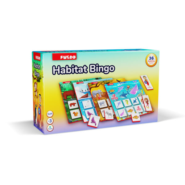 Habitat Bingo is a double sided matching game designed to teach the child certain animals and their habitats. It contains 28 visuals on 4 different habitat game cards.Variety of visuals representing different animals from all over the world, including an octopus under the sea, a zebra in a savanna, a fox in a forest, and a penguin on the pole, are matched. Thus the visuals are storified to help the child to get to know each animal and to associate it with its habitat in a fun way.