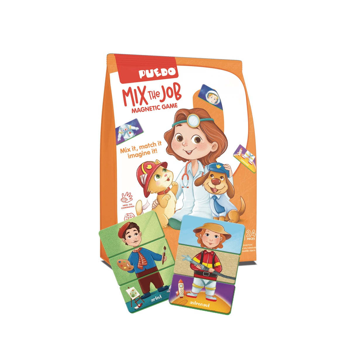 PUEDO® Mix The Job Magnetic Game, 3 yaş ve üzeri çocuklar için tasarlanmış, 8 farklı mesleği regarenk çizimlerle tanıtan eğitici ve eğlenceli bir kutu oyunudur.
