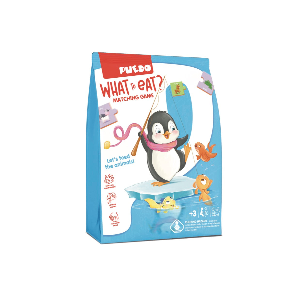 PUEDO® What To Eat?, 3 yaş ve üzeri çocuklar için tasarlanmış, hayvanların beslenme alışkanlıklarını öğreten eğitici ve eğlenceli bir eşleştirme oyunudur.
